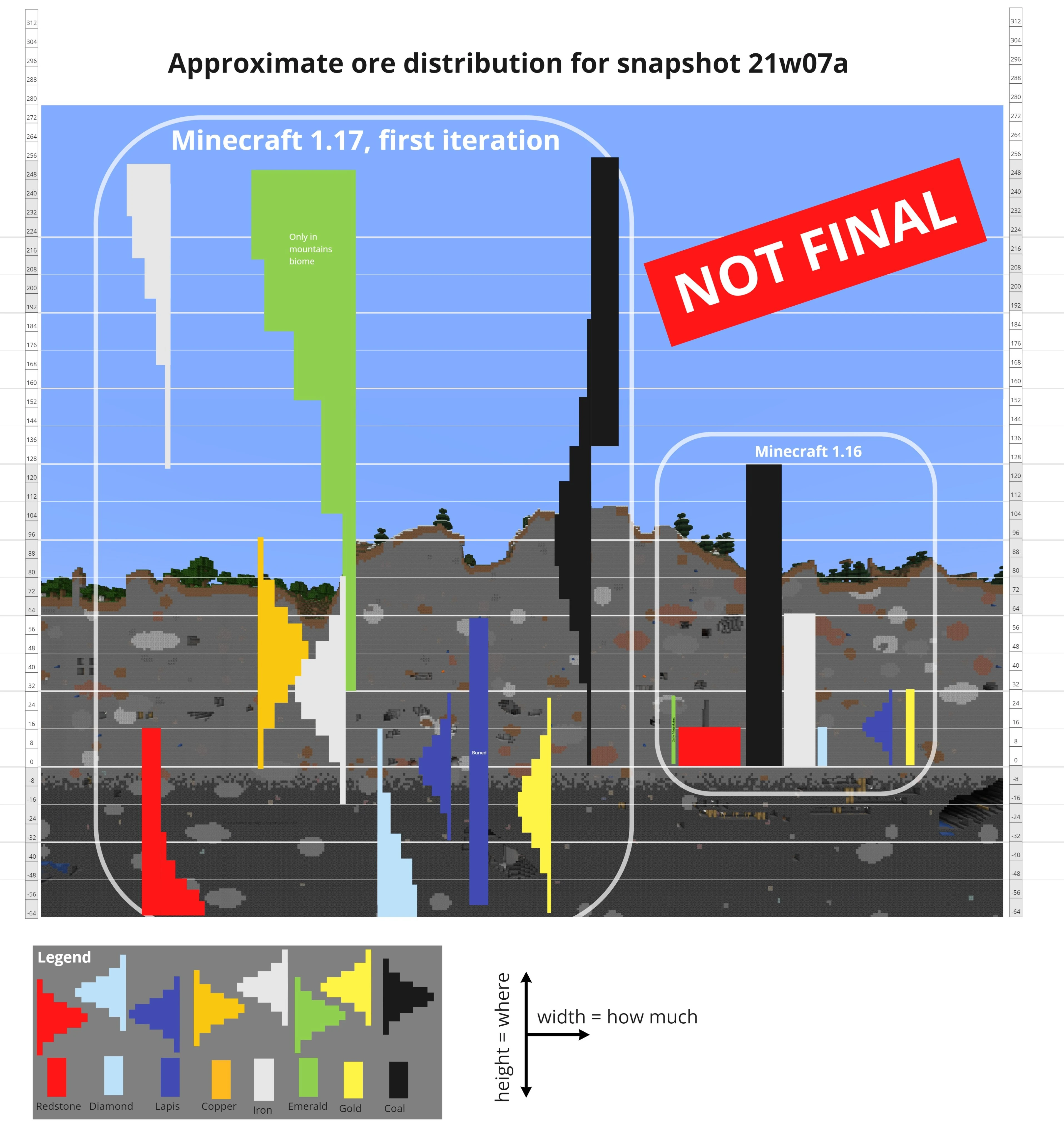 - La distribution des minerais a été changée pour leur donner une génération étalée comme le minerai de lapis-lazuli. Certains gardent une génération linéaire en plus d'une génération étalée.