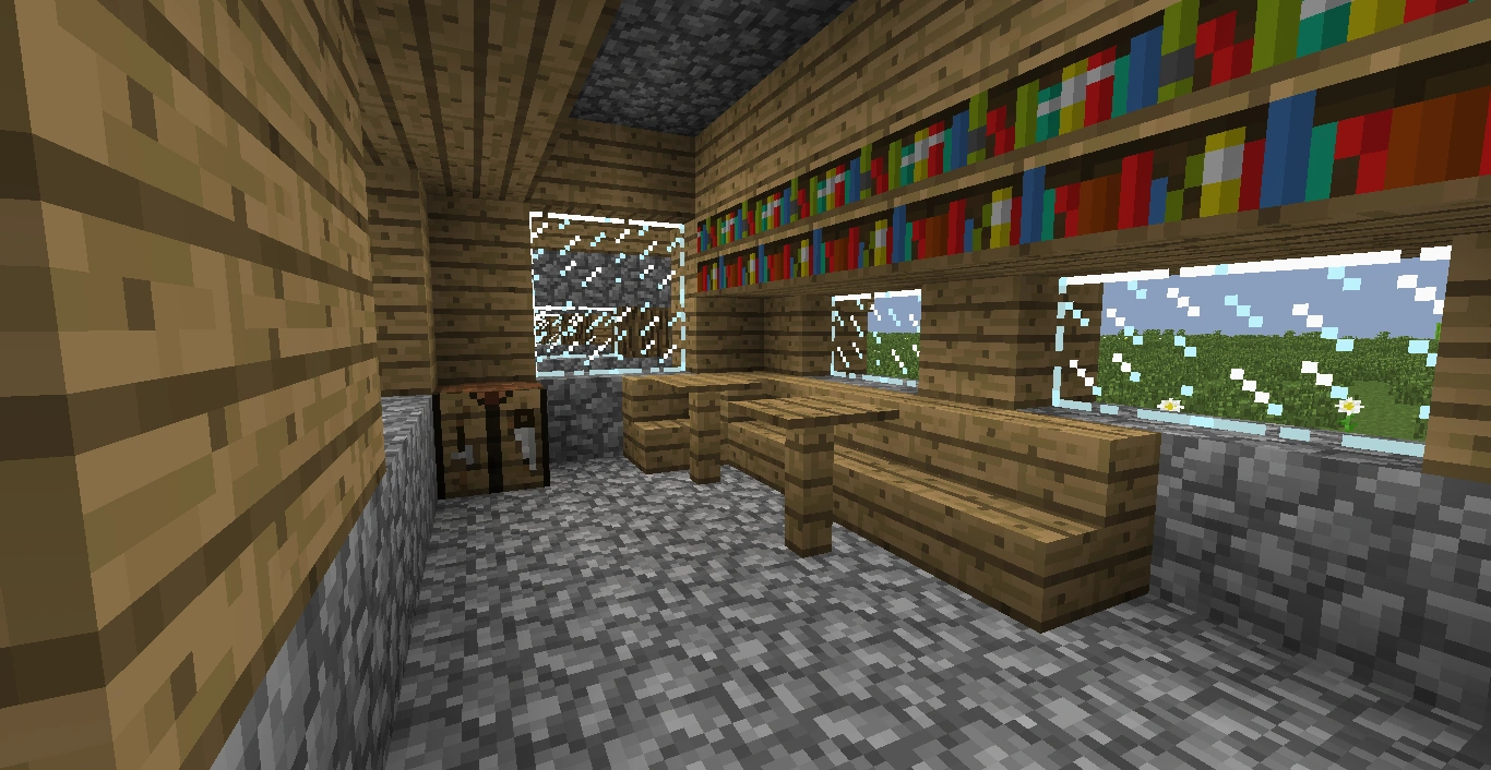 | Bibliothèque | Les bibliothèques sont plus longues et plus étroites que les autres bâtiments. Le mobilier est composé d'une rangée de bancs en bois (ou en grès) et de deux tables. Une rangée de bibliothèques surplombe le tout. La fenêtre est plus grande que celles des autres bâtiments, mais un manque d'éclairage nocturne se fait ressentir. Un établi est placé dans un coin, où un champignon peut pousser dessus. Un bibliothécaire apparait dans chaque bibliothèque. | |