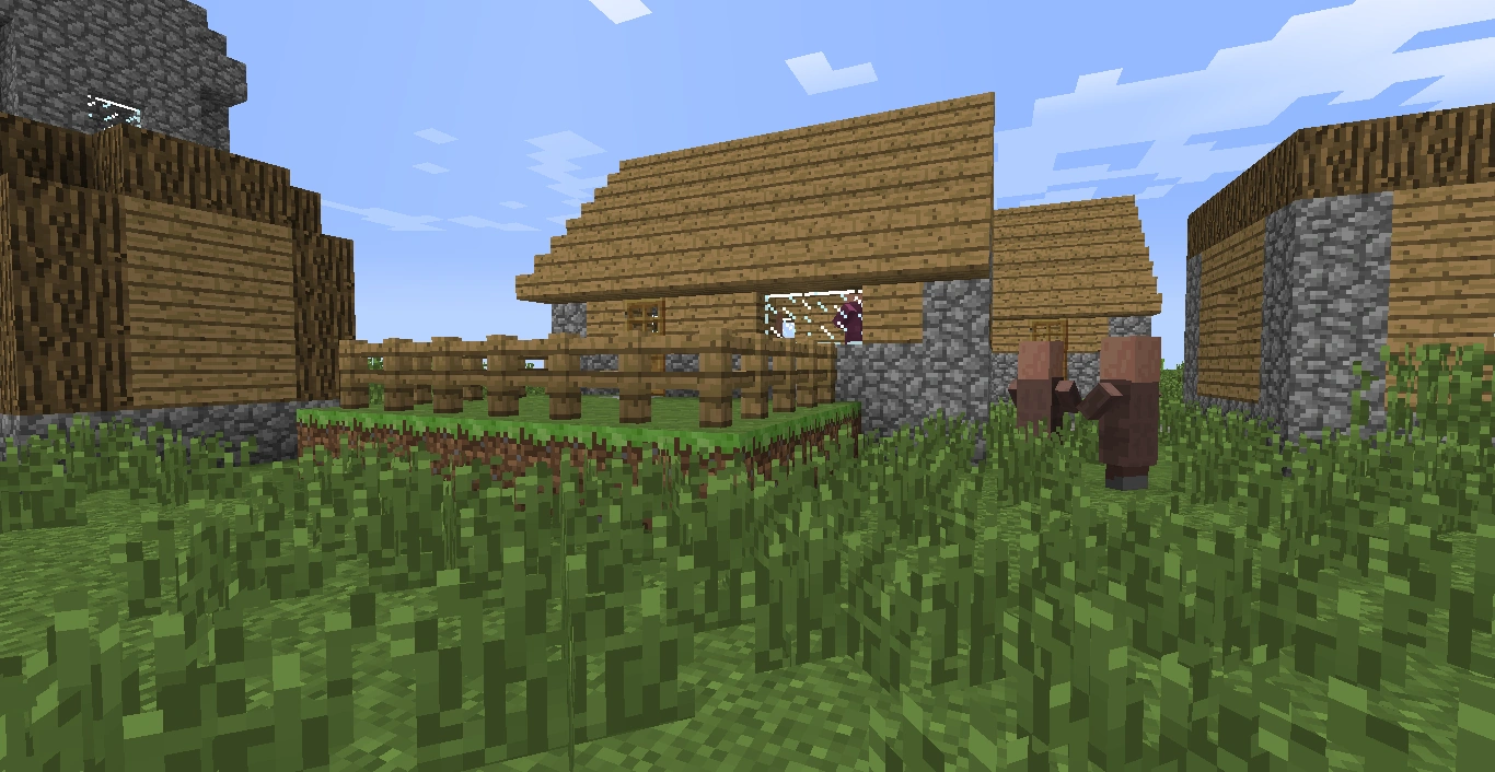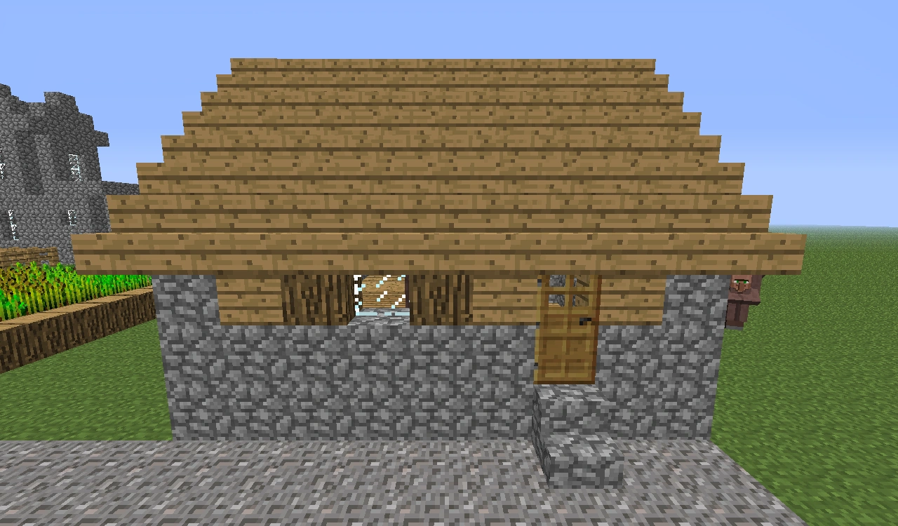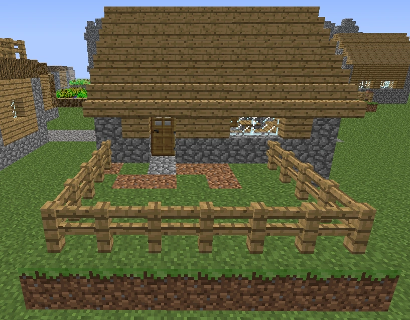 | Petite maison | Les petites maisons sont des bâtiments semblables aux cabanes, mais possèdent un sol en pierres ou en grès, et leurs toits sont toujours plats ; elles peuvent avoir ou non des barrières sur leur toit, lui-même accessible par une échelle, d'où l'on a une bonne vue sur le village qui n'est par ailleurs pas aussi bonne que celle de l'église. Elles n'ont pas de porte, et un villageois de profession aléatoire y est généré habituellement, même s'il ne reste pas à l'intérieur en raison de l'absence de porte. | |