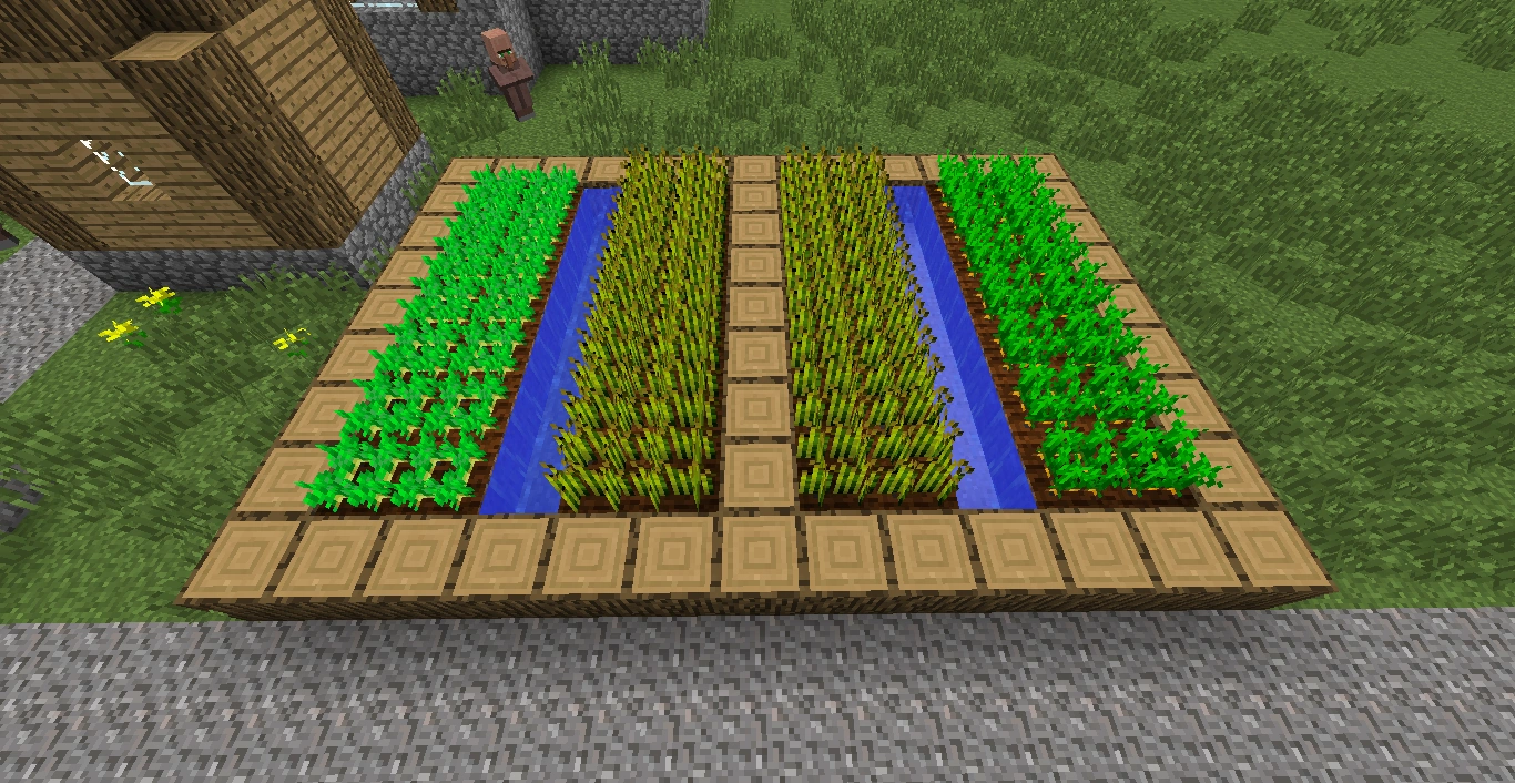 | Ferme | Les fermes peuvent être petites ou grandes. Toutes sont constituées de parcelles séparées par des lignes d'eau, entourées de bûches de bois ou de grès. Les petites exploitations contiennent 2 parcelles de cultures (de blé, de pomme de terre, de carottes ou de betteraves) de 7x2 blocs chacune, séparées par une ligne d'eau. Les grandes exploitations sont deux petites exploitations réunies côte-à-côte, avec une passerelle au milieu au lieu d'une troisième ligne d'eau. | |