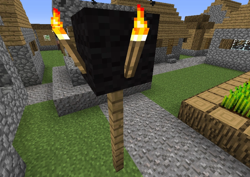 | Lampadaire | Les lampadaires peuvent être trouvés n'importe où dans les villages. Ils se composent de trois barrières empilées surmontées d'une laine noire sur laquelle sont posées quatre torches, une de chaque côté du bloc. | |