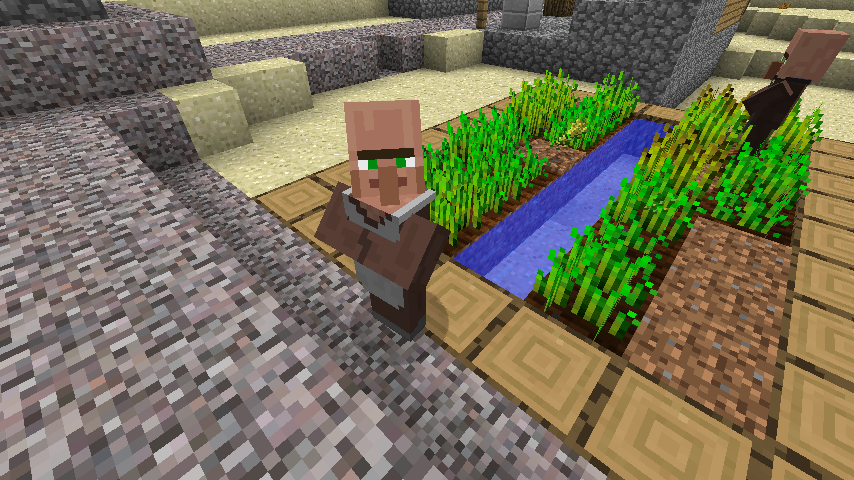 - Si un villageois fermier a des graines, des carottes, des patates ou des graines de betterave dans son inventaire et qu'il trouve un bloc d'air au-dessus d'un bloc de terre labourée, il se déplacera jusqu'au bloc et y plantera une pousse. Il plante toujours le contenu du premier emplacement valable de son inventaire.