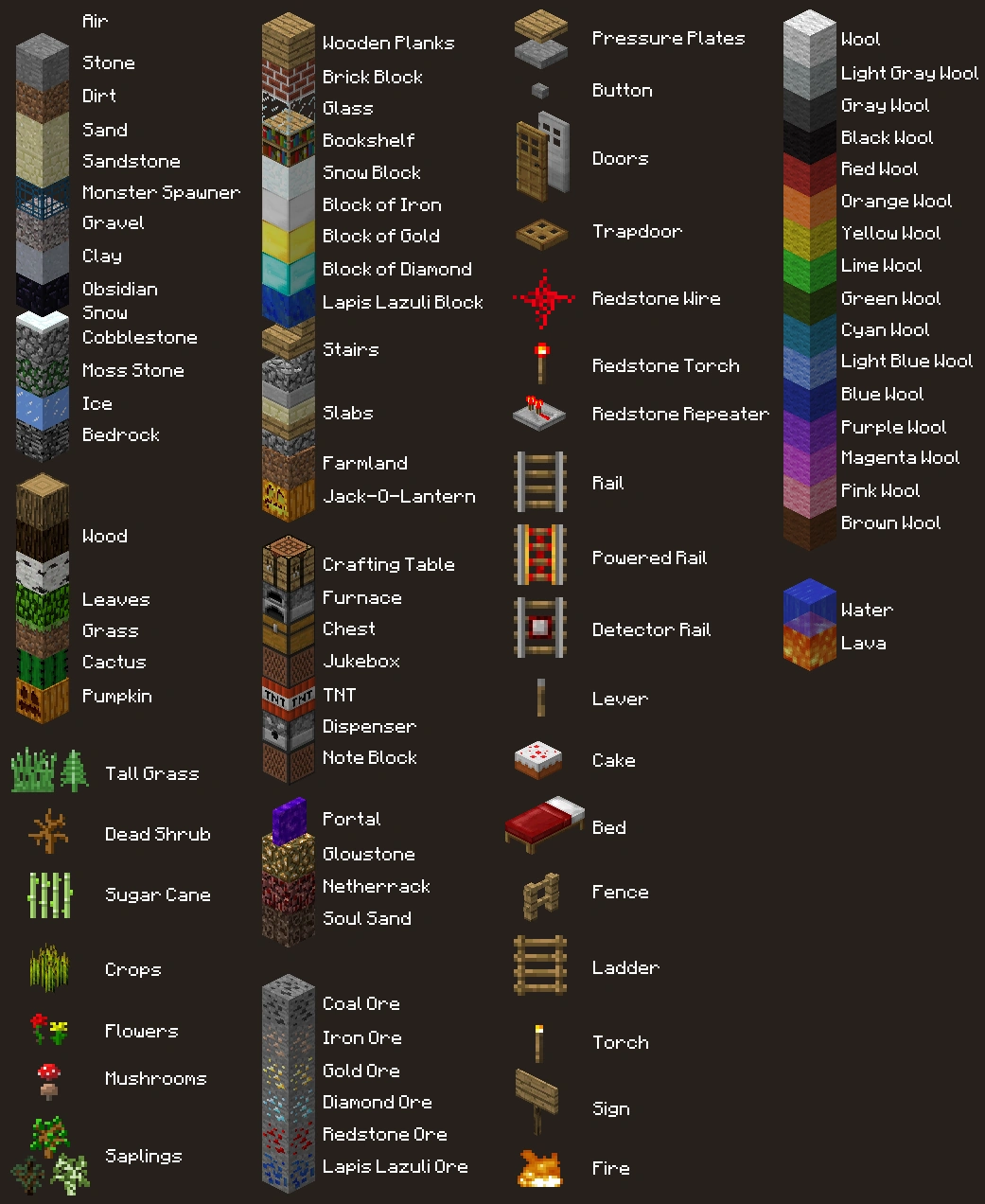 Jelenleg 77 különböző blokk-típus van (a Levegőt, a mozdulatlan vizet, és a mozdulatlan Lávát is beleszámítva, amiket jelenleg nem lehet építeni (lásd az adatértékeket a teljes listáért)).