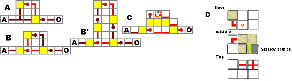 Az A elrendezés rövid impulzust generál, amikor a kimenet "ki". A bemenet invertálása, mint azt a B-n is láthatjuk, a kimenet pulzálni fog, amikor a bemenet bekapcsol. Az impulzus hosszúságát extra inverterekkel növelni lehet, mint azt a B-n is láthatjuk. Ez a T flip-flopok szerves része, mert megakadályozza, hogy a flip-flop többször megváltozzon műveletenként. Az A és B elrendezéseket össze lehet rakni, hogy mind az A növekedését és az A csökkenését különböző kimenet szimbolizálja, ezekhez hozzá lehet kötni egy OR kaput, hogy megtudjuk, mikor változik a bemenet, az állásától függetlenül. A vöröskő-jelismétlőket az impulzus hosszúságának megváltoztatására lehet használni, egyet vagy többet sorba helyezni a késleltető áramkörben a két vöröskőfáklya között (az A elrendezésre vonatkozva). MEGJEGYZÉS: Ez az elrendezés az 1.6-os verzióban már nem működik. Ahhoz, hogy akármilyen impulzust át lehessen küldeni, legalább eggyel több késleltető fáklya kell, hogy ne romoljon el az impulzusgenerátor.