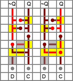 Végül, az észak/déli csavar arra is szolgál, hogy legyen két jeled, amik ellentétes állapotúak, de a NOT kapunál lévő 1-tikkes késleltetés nélkül. (Lásd 2. ábra.) Ez különösen hasznos lehet olyan áramkörökben, ahol fontos az időzítés, pl. jelfeldolgozásnál különböző detektoroknál (lásd Impulzusgenerátor lejjebb) és aztán OR kapukat téve a kimenetükhöz.