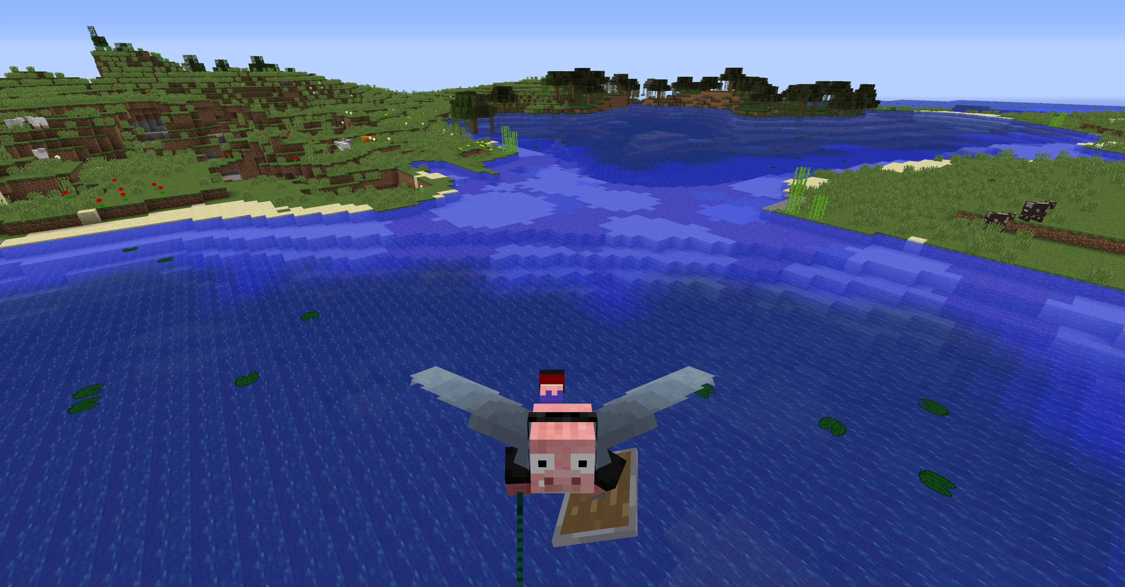 - エリトラで滑空しているときに馬やロバなどの騎乗できるMobに乗ると滑空状態でMobに乗った状態になる。