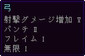 | 無限 | 無限 | 射撃時に矢を消費しなくなる。修繕と競合する。 | I | 1 | ||