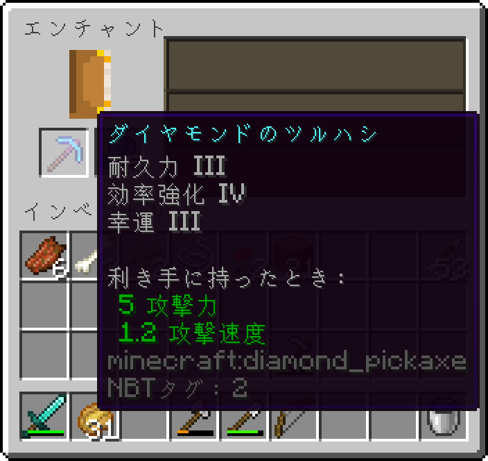 | シルクタッチ | シルクタッチ | 採掘したブロックそのものを入手できる。幸運と競合する。 | I | [BE限定] | 1 | |
