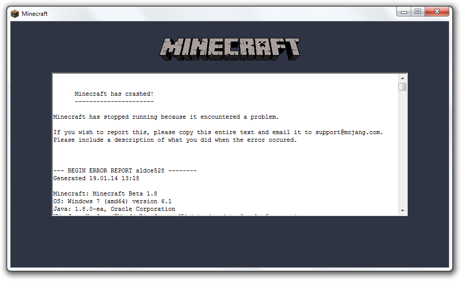 クラッシュにはエラーレポート機能があったが、その機能は削除されている。しかし、一瞬であるが、ゲームを終了する直前にエラーレポートが表示されることがある。Minecraft の起動時にこれが表示されることがあり、その場合はゲームをプレイできない。ただし、これが起こる確率はほぼないと言っていい。