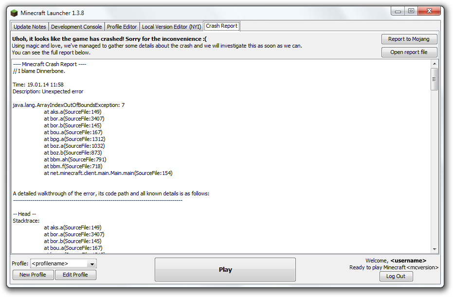 以前までの Minecraft のクラッシュ画面
