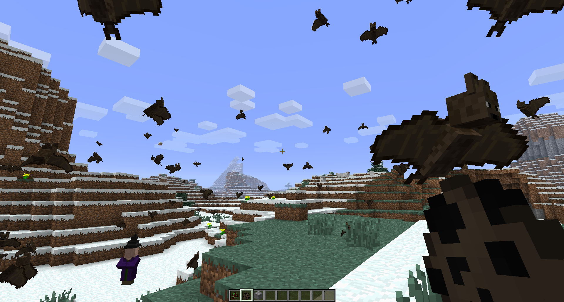 | 1.4.2 | 12w38a | コウモリが追加される。ふらふらと飛び回り、時々溶岩に飛び込む傾向がある。倒されても何もアイテムをドロップすることはない。コウモリは小麦を示されても何の反応も見せず、持ったまま右クリックしても反応しない。コウモリは作物を「踏みつける」ことができ、その結果アイテムをドロップさせ耕地を土に戻してしまう。 | |||