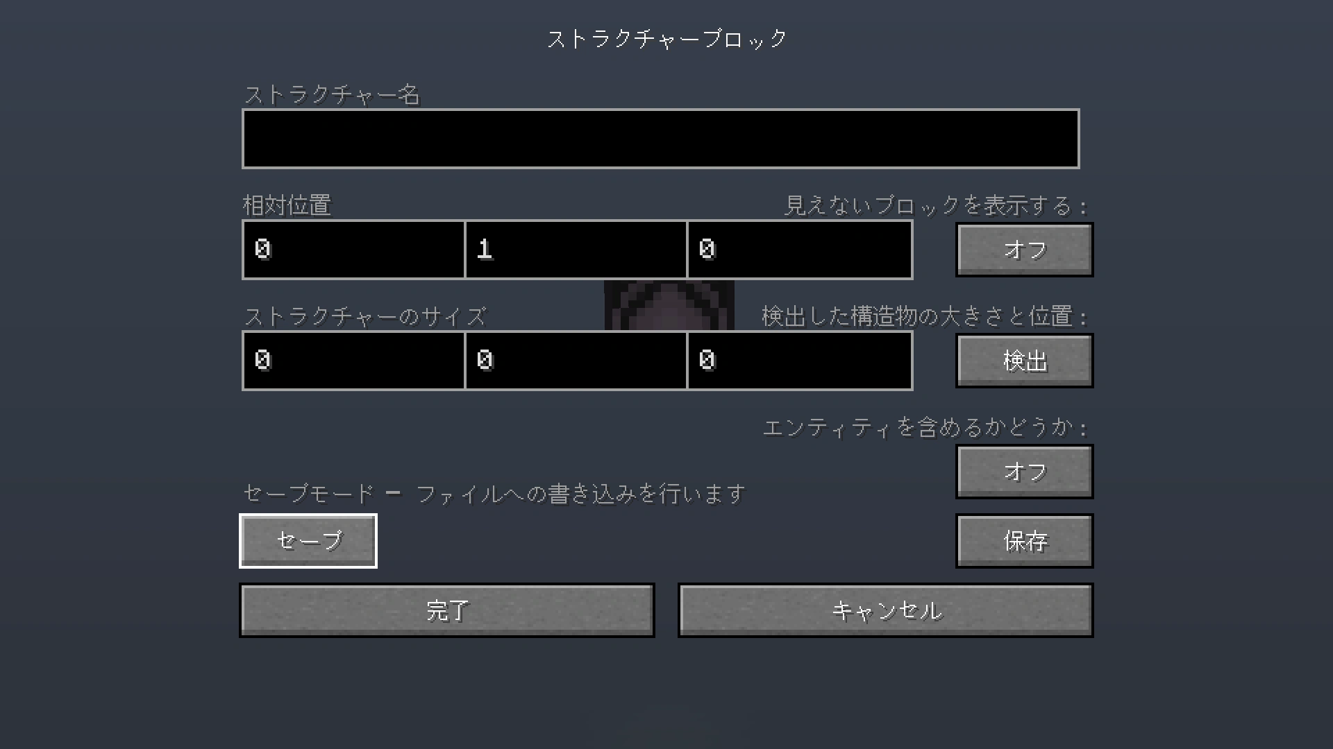 - ストラクチャーブロックの位置を基準とした構造体のX座標、Y座標、Z座標を入力する。構造体の外形の原点を設定する。