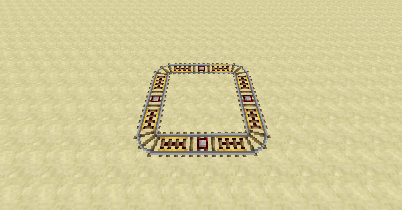 希望の大きさと形状に道路を構築します。レッドストーンランプを設置する場所に平行にディテクターレールを設置します。パワードレールを使用してトロッコの速度を一定に保つように心がけてください。ただし、レッドストーントーチはレッドストーンの邪魔にならない場所に設置して下さい。