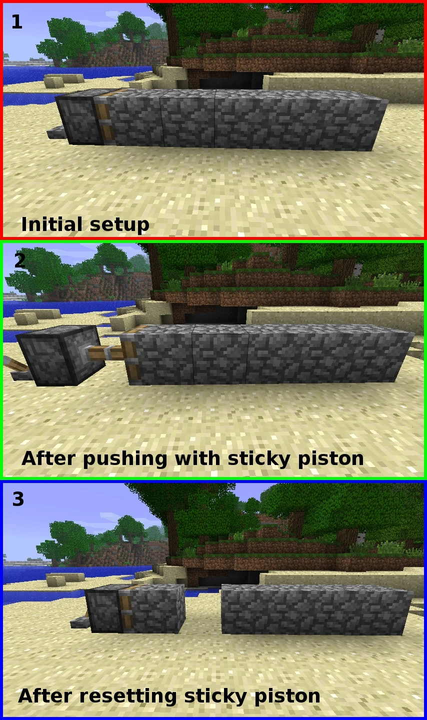 粘着ピストンはヘッド格納時のみブロックを一緒に引く能力を有している。そのため、粘着ブロックのヘッドの隣にあるブロックは別のピストンや粘着ピストンで押すことができる。また、押したブロックが重力によって落下するのを防ぐことはできない。Java Editionでは、プッシュを開始した「後」はブロックを引かない。これは、ピストンに短いパルス、具体的には3ゲームティックまたは1.5レッドストーンティック(0.15秒、遅延なし)より短いパルスを与えることで実行できる。