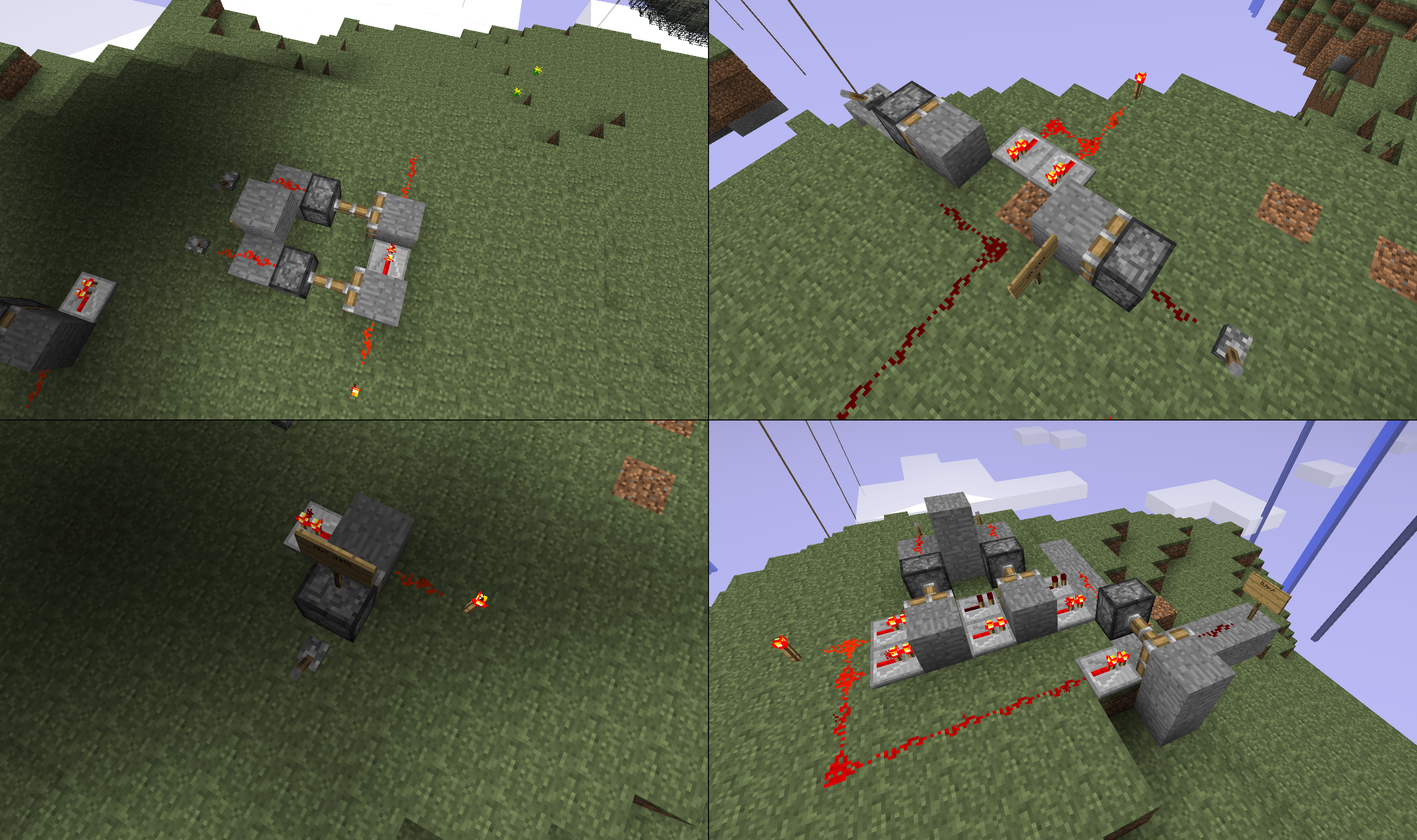 純粋にピストンとレッドストーンリピーターのみで実装された基礎的な論理回路。左上から時計回りにAND・OR・XOR・NOT。