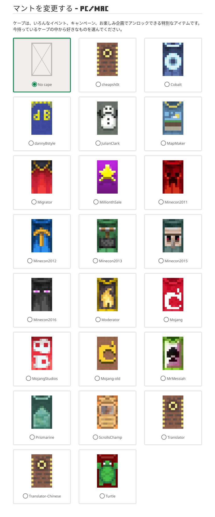 Java Editionで公式のマントを1つでも所持しているプレイヤーは、their Minecraft profileへ行くことで、どのマントを装備するか選択することができる。