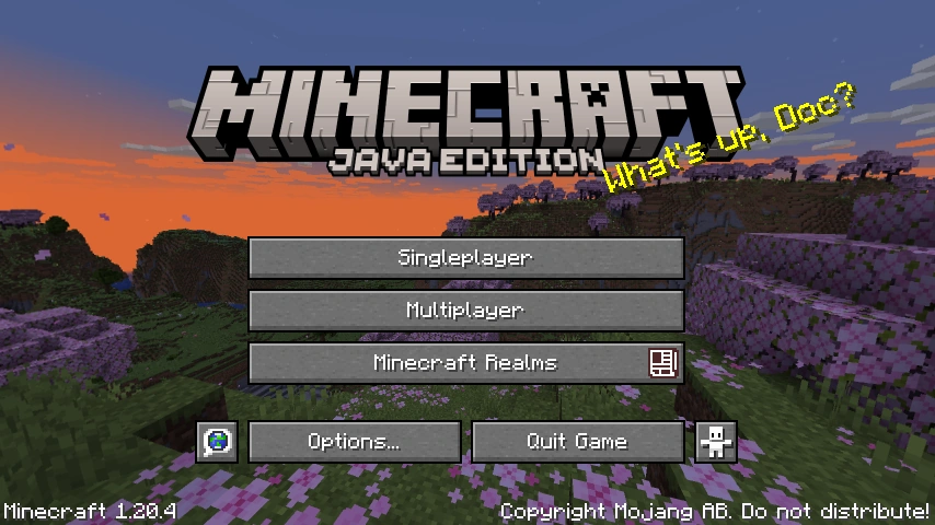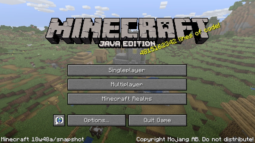 メインメニュー画面の中央上部にはゲームのロゴが映し出され、その横にはスプラッシュテキストが表示されている。背景にはゲームのバージョンに対応したパノラマが流れている。