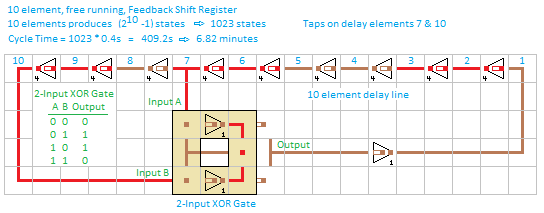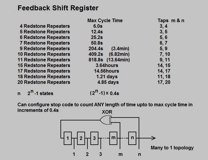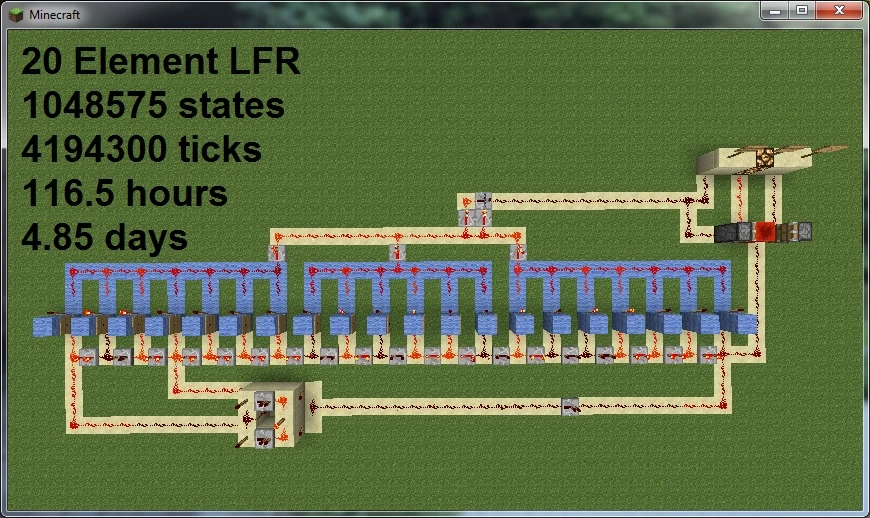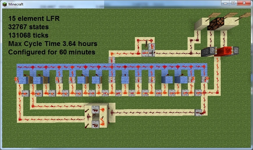 XORゲートは、レッドストーンリピーター7と10からの入力(遅延)を取る。簡単にするため、2遅延のLFSR配列が並べられている。Minecraftでは、これを1多遅延線構造にし、より複雑なクロックを作ることができる。
