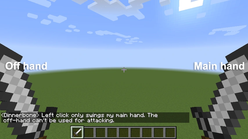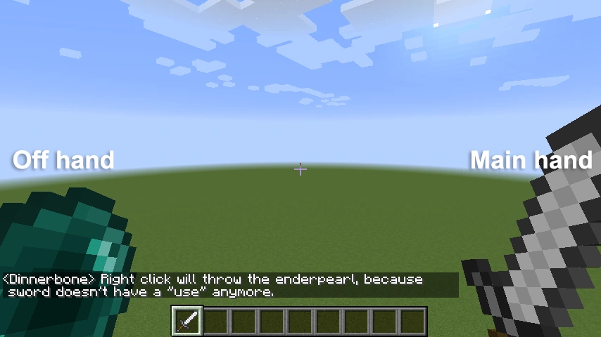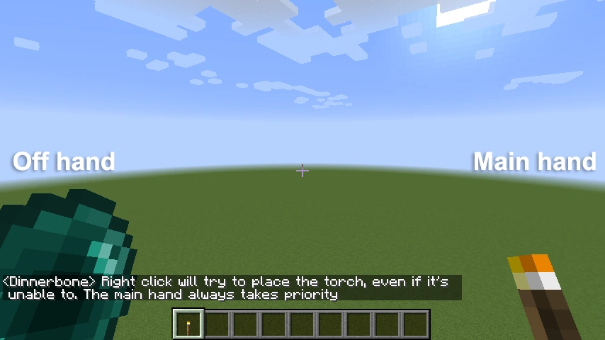オフハンドは、メインハンドに使用可能なアイテム(例えば、剣)がないときに保持するアイテムを使用することができ、またはメインハンド上に保持されたアイテムは直接使用することができない(例えば、シャベルまたはクワの近くにない草ブロック)。そうでなければ、メインハンドはオフハンドより優先される。プレイヤーは、たとえ何もメインハンドに保持されていなくても、ブロックを解除したり、オフハンドで攻撃することはできない。
