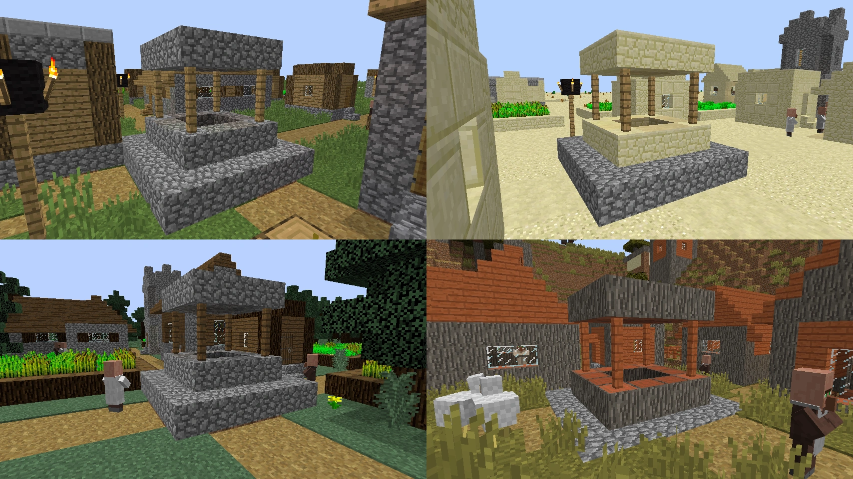 また、以下で述べるように村を構成するブロックの一部は、その種類によって変化する。例えば、砂漠の村では水上では草の道と木材の橋の代わりに、砂岩と滑らかな砂岩の橋が生成される。