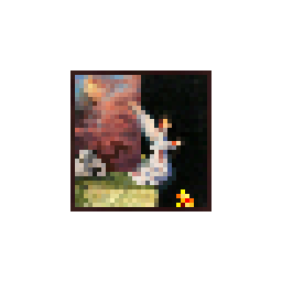キャンバスの中の豚を指差している少女の絵。オリジナルの絵では、キャンバスにはコンピューターのディスプレイで標準使用されているRGBカラーモデルの赤、緑、青の三原色が描かれている。 | Alpha v1.1.1 |