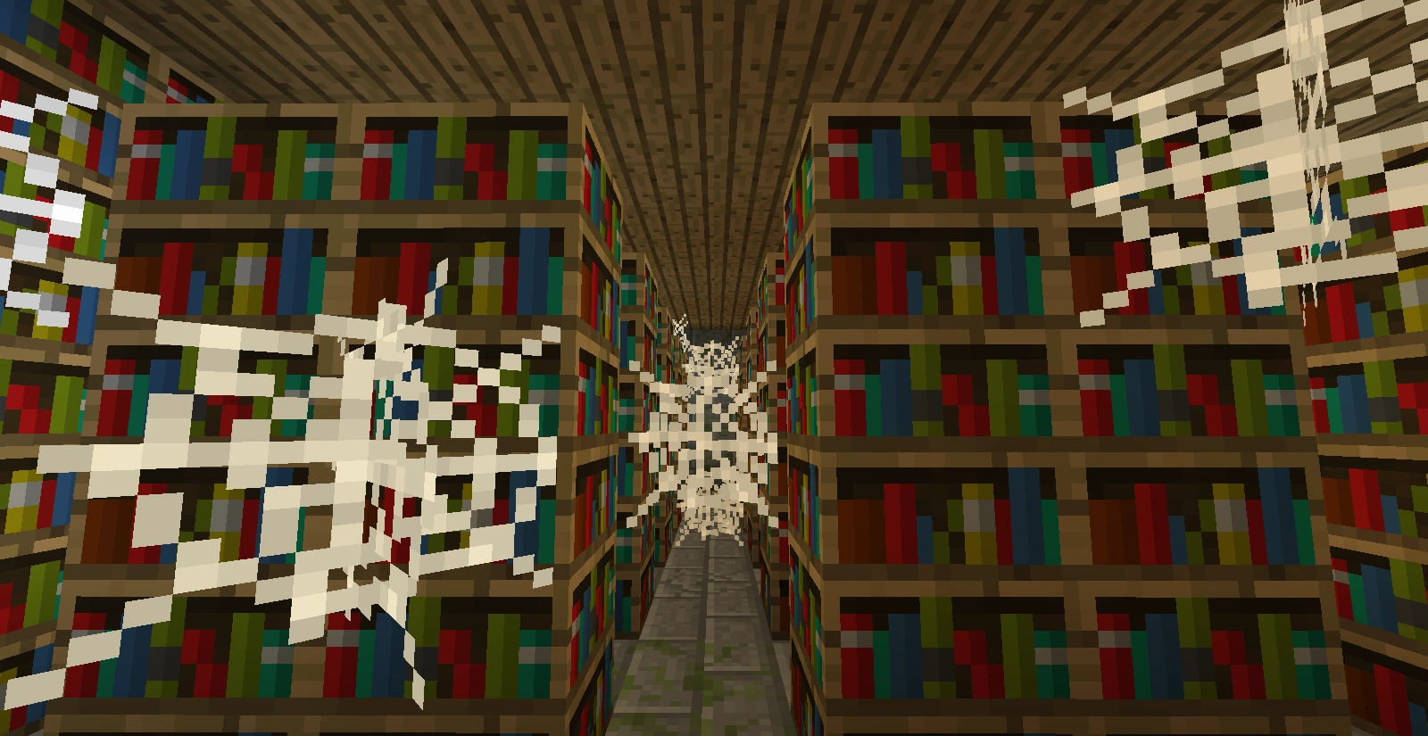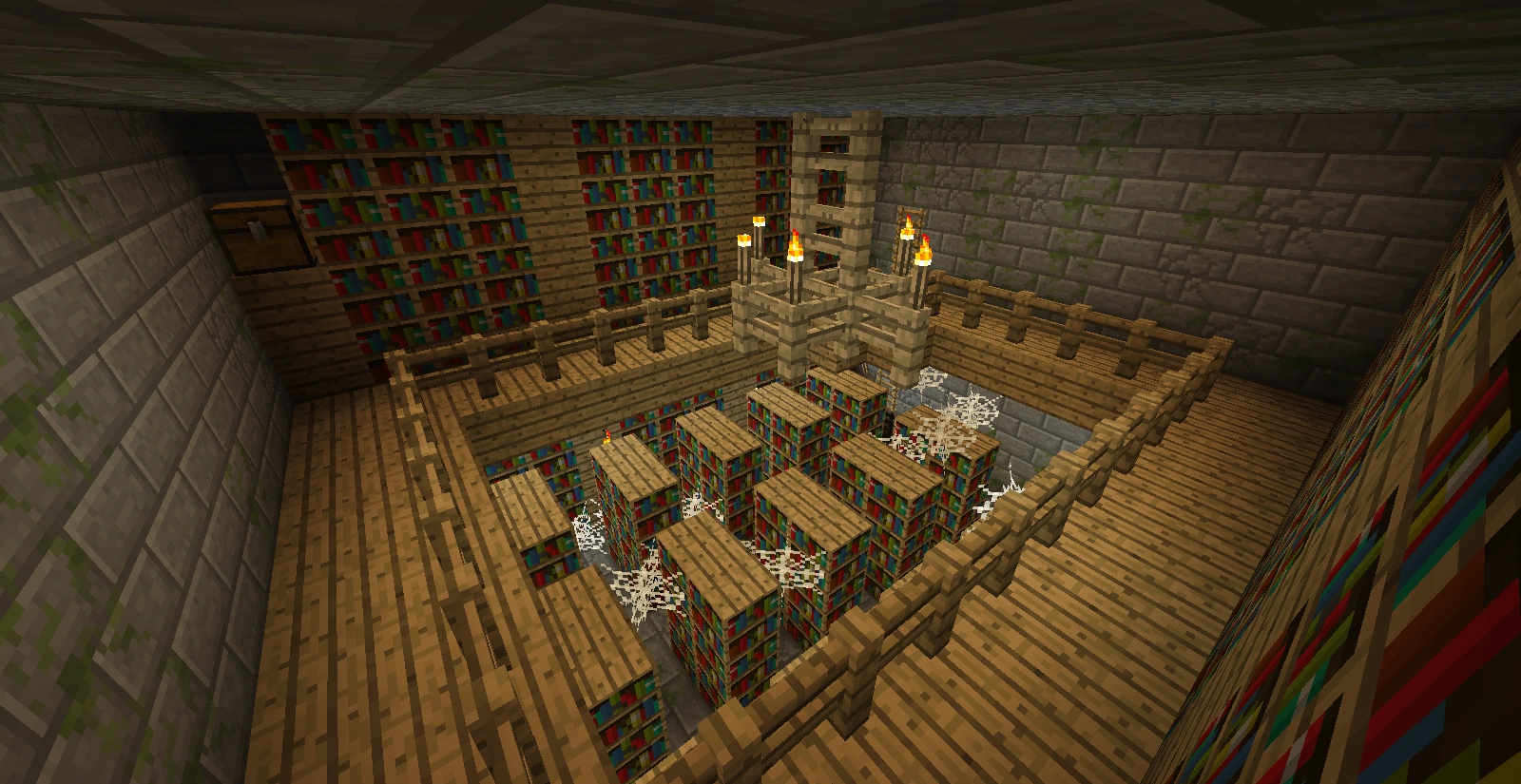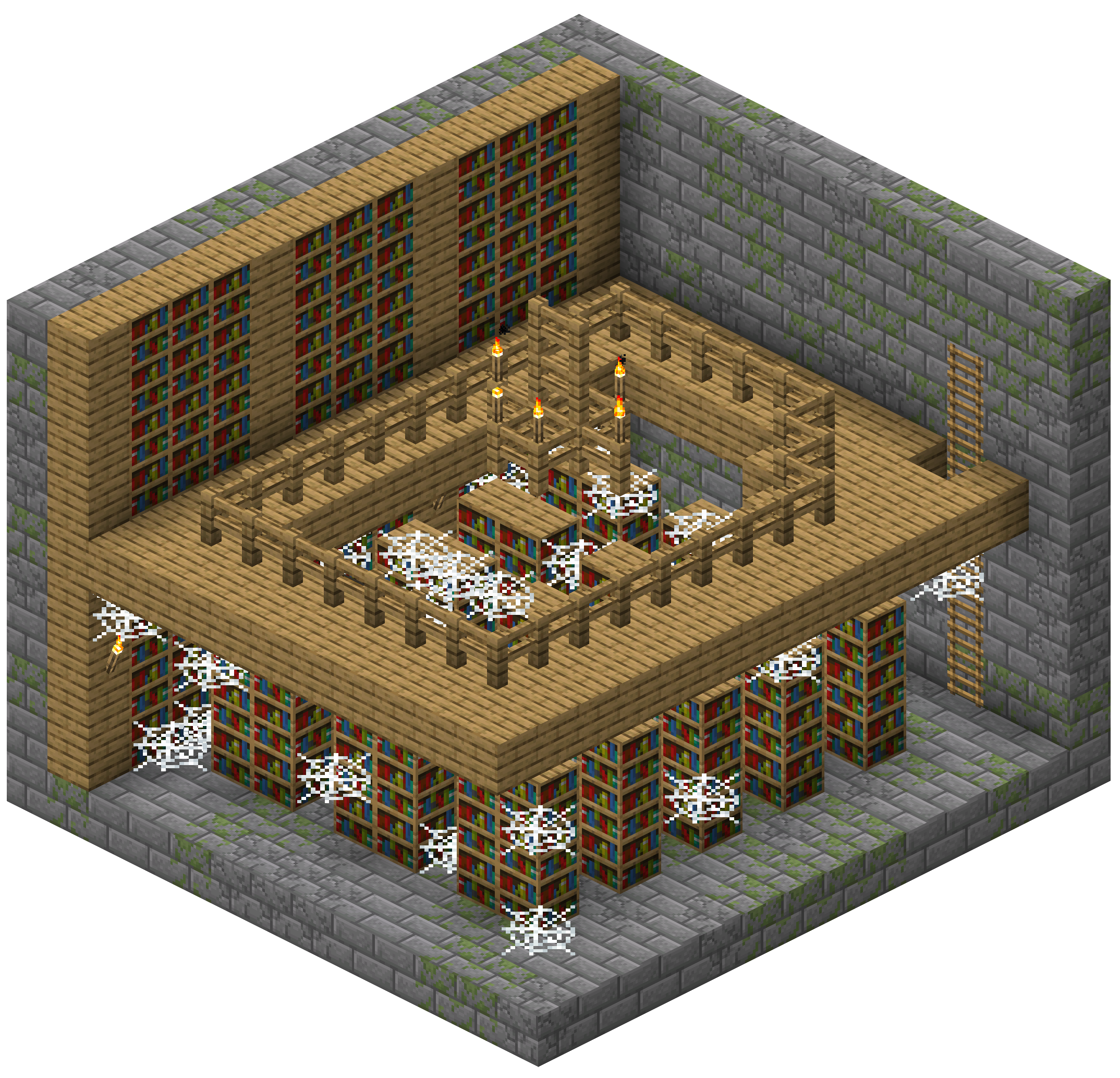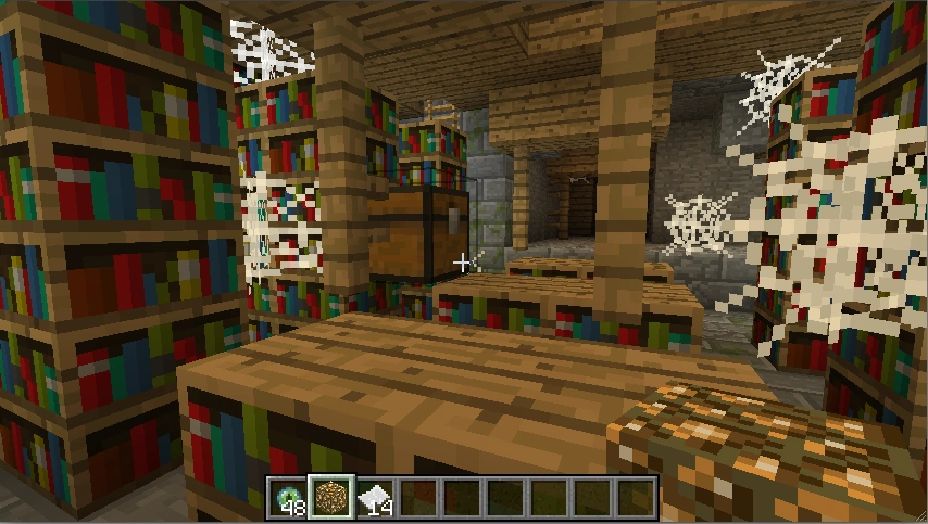 - 図書室:図書室は要塞一つにつき0~2個部屋生成され、最初の螺旋階段から5部屋以上遠くに生成される。図書室には、1層しかない小さな図書室と2層建ての大きな図書室の2種類がある。図書室には大量の本棚とクモの巣、オークの板材があり、宝物の入ったチェストは1層なら1つ、2層なら2つ生成される。1層の図書室が生成されるのは、他の要塞の部屋が先に生成されているために2層の図書室を生成することができない場合のみである。なお図書室には出口はなく、行き止まりになっている。