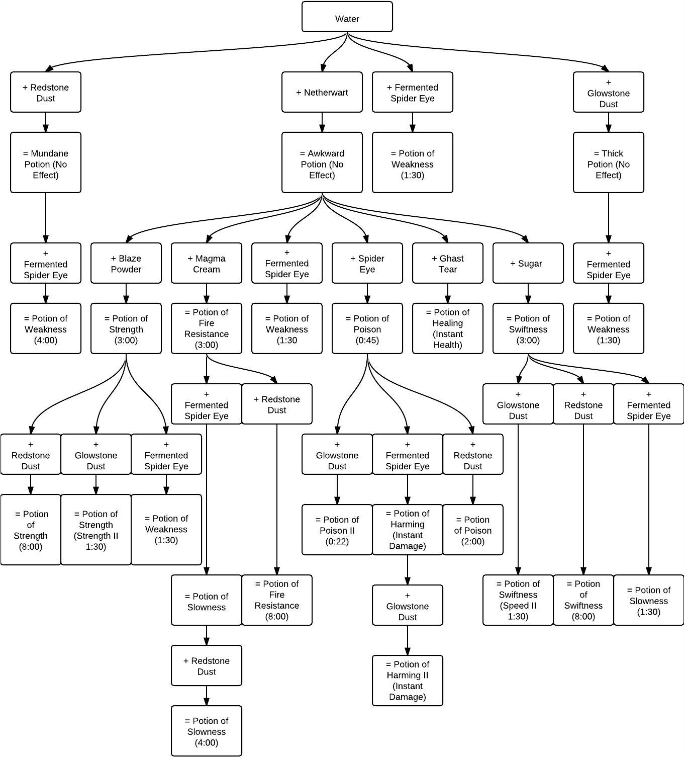 - まずネザーウォート集めから始めよう。右側にあるチャートにあるとおり、奇妙なポーションからは全ての正の効果のポーションが作り出せるが、それ以外の基礎ポーションからは弱化のポーションが作製できるのみだからだ。弱化のポーションを意識して作りたいのでない限り、奇妙なポーションから始めるべきだ。そして弱化のポーションであれば、発酵したクモの目を直接水入り瓶に醸造するのがより効率的であり、ネザーウォートを節約できる。