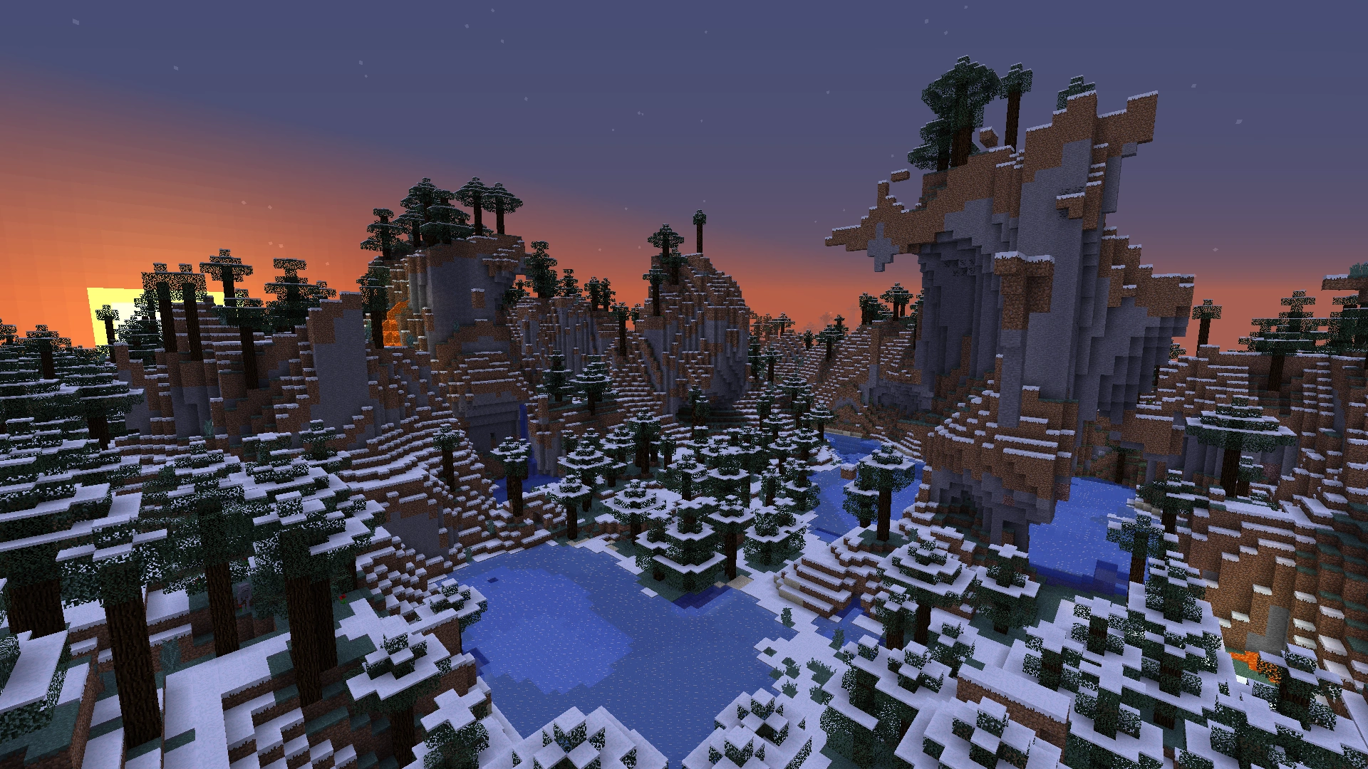 Like all other hills biomes, Snowy Taiga Hills (known as Cold Taiga Hills before 1.13) feature hillier, more erratic terrain. These hills are somewhat steeper than other hills biomes, making this variant more difficult for survival. Igloos will not generate in this biome, unlike the regular snowy taiga.