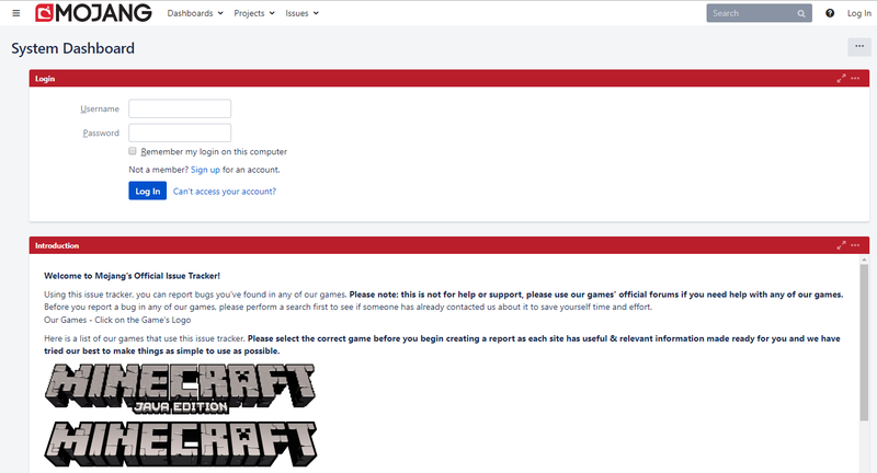 以前は、Minecraft Wikiの問題点ページを使用して問題報告を管理していた。しかし多くの人が使い方が複雑すぎると不満を述べており、Wikiを使用せず適切なバグトラッカーが必要とされたため、MojangはAtlassianに電子メールを送信し、適切なバグトラッカーの作成に関するアドバイスを求めた。Atlassianはすぐに支援を申し出、無料のJIRAライセンスを提供した。JIRA v5.0向けに改善されたJIRA開発者のAPIを紹介する映像が公開された。