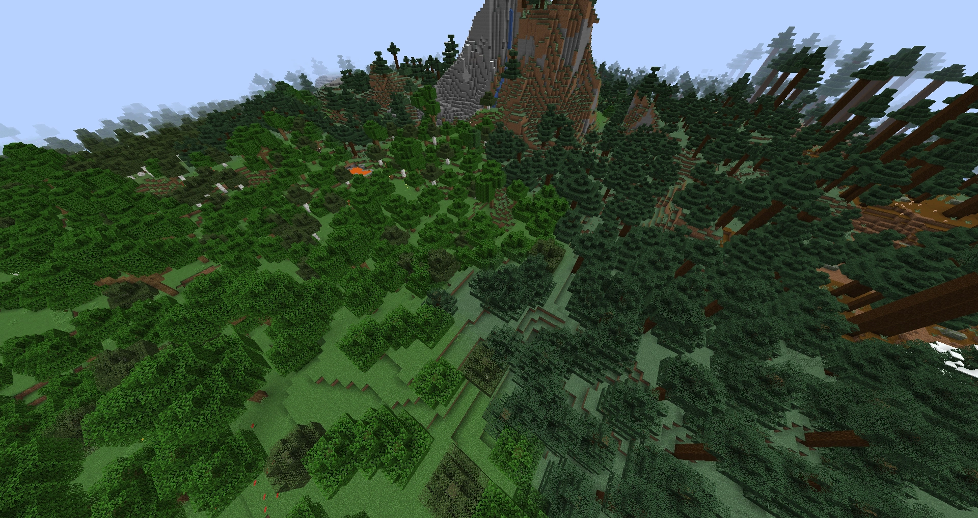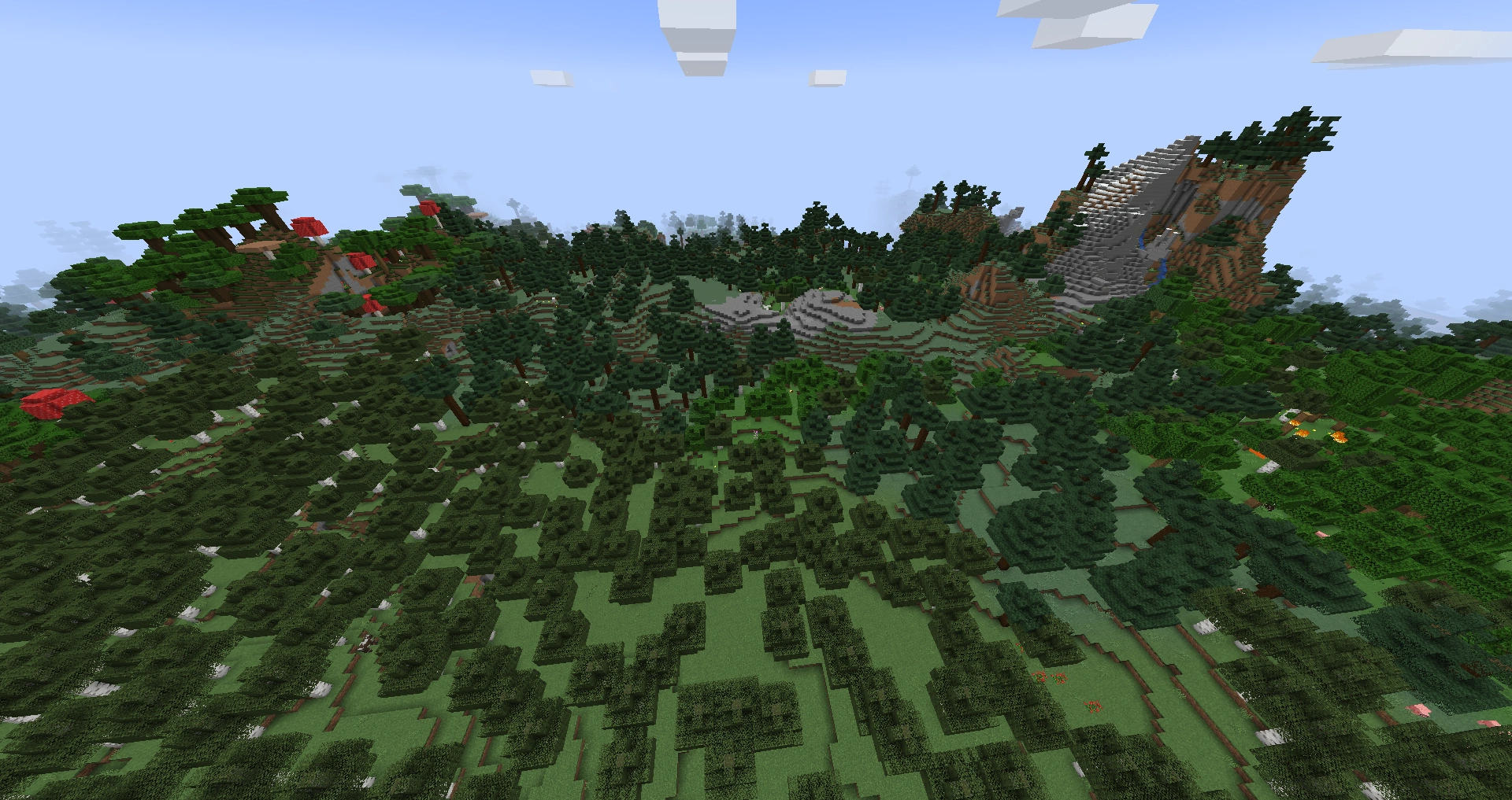- 森のある丘陵、シラカバの森の丘陵、巨大シラカバの丘陵、タイガの丘陵、タイガの山、砂利の山+、砂漠の丘陵、砂漠の湖、サバンナの高原、荒廃したサバンナの高原、沼地の丘陵、暗い森の丘陵、氷樹、雪山、雪のタイガの丘陵、雪のタイガの山、変異したジャングル、ジャングルの丘陵、竹林の丘、ジャングルの端、変異したジャングルの端、巨大樹のタイガの丘陵、巨大トウヒのタイガの丘陵、侵食された荒野、荒野の高原、変異した荒野の高原、変異した森のある荒野の高原、キノコ島の海岸