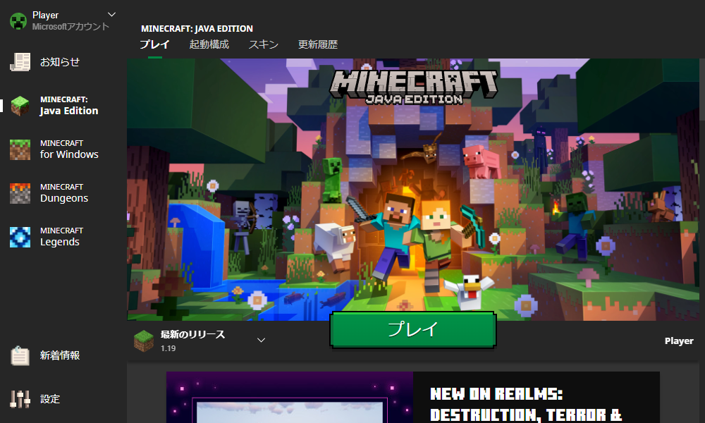ランチャーを初めて開くと、Minecraft の最新バージョンが選択されているプロファイルが作成、選択される。このプロファイルを削除することはできない。