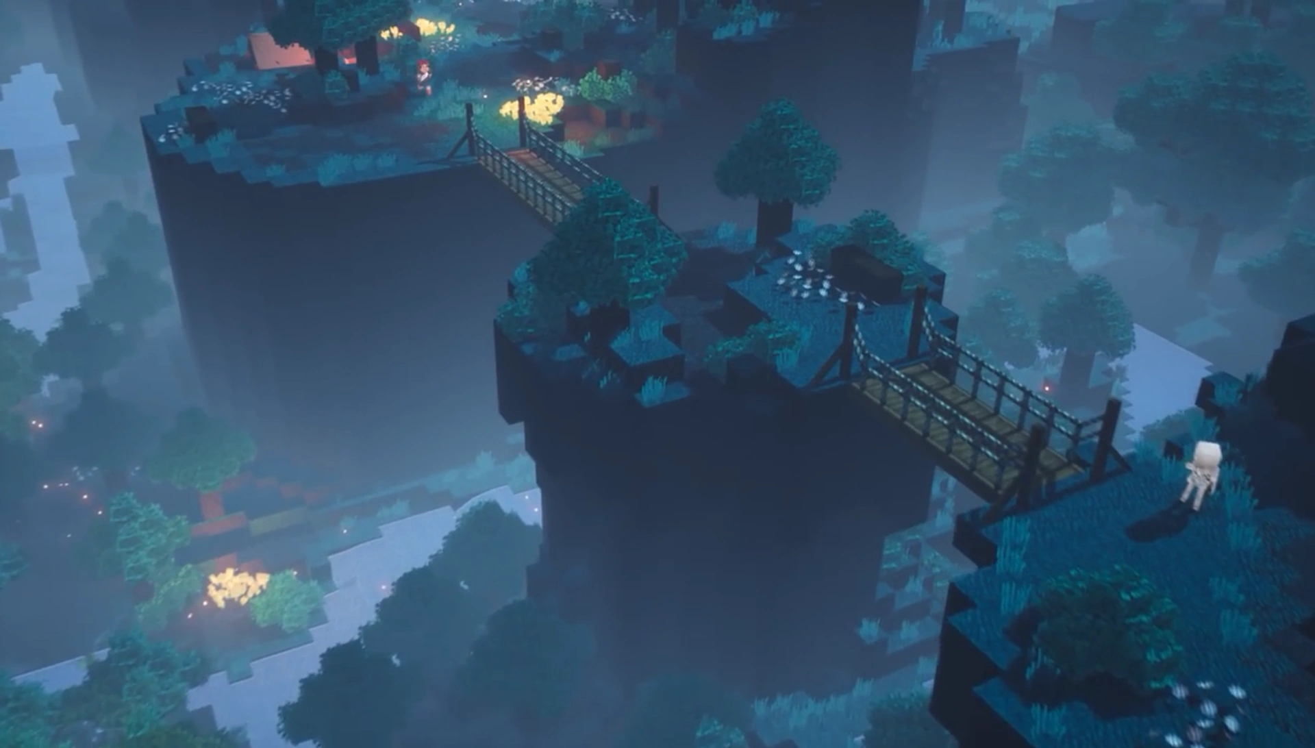 森のどこかで、キャラバンが村人の囚人を遠く離れた土地で働くために輸送している。 邪悪な村人は、村人のために初歩的な刑務所を建設した。 There are vindicators patrolling to deter villager's escape attempts. They made it dim by only having embers from the campfire to light up the environment.