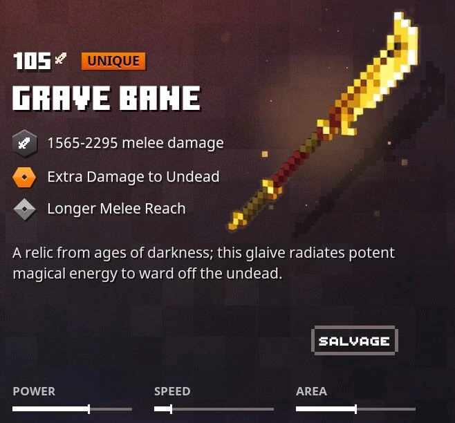 The Grave Bane possesses high power, low speed and moderate range, and has a combo consisting of two overhead strikes and a sweep attack dealing more damage, much like a normal glaive.