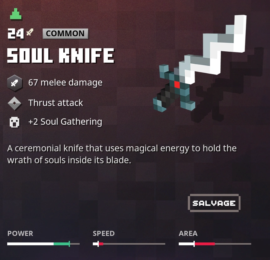 魂のナイフは高威力、低速、短距離を持ち、突き刺しのみで攻撃する。