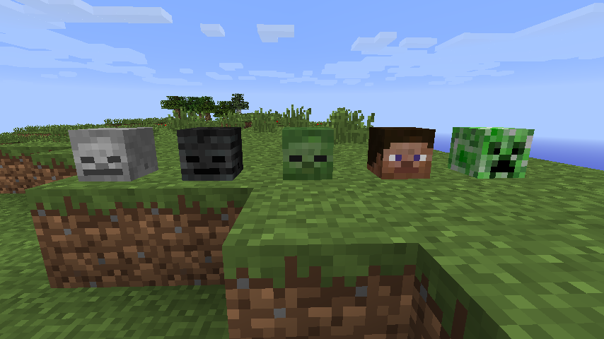 /giveや他のインベントリーを書き換えるコマンドを使うことで、平面に見えるソウルサンドに見える、「頭」ブロックを入手できる。 - ゾンビ、スケルトン、ゾンビピッグマンは「頭」を被ることができる[6]。