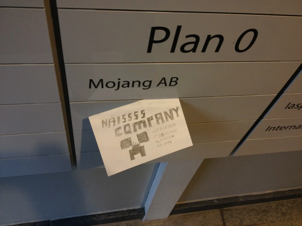 ![Mojang のビルの案内板とGrieferからのメモ[53]](https://static.wikia.nocookie.net/minecraft_ja_gamepedia/images/3/32/Mojang_office_griefers.jpg/revision/latest/scale-to-width-down/120?cb=20121212214616)