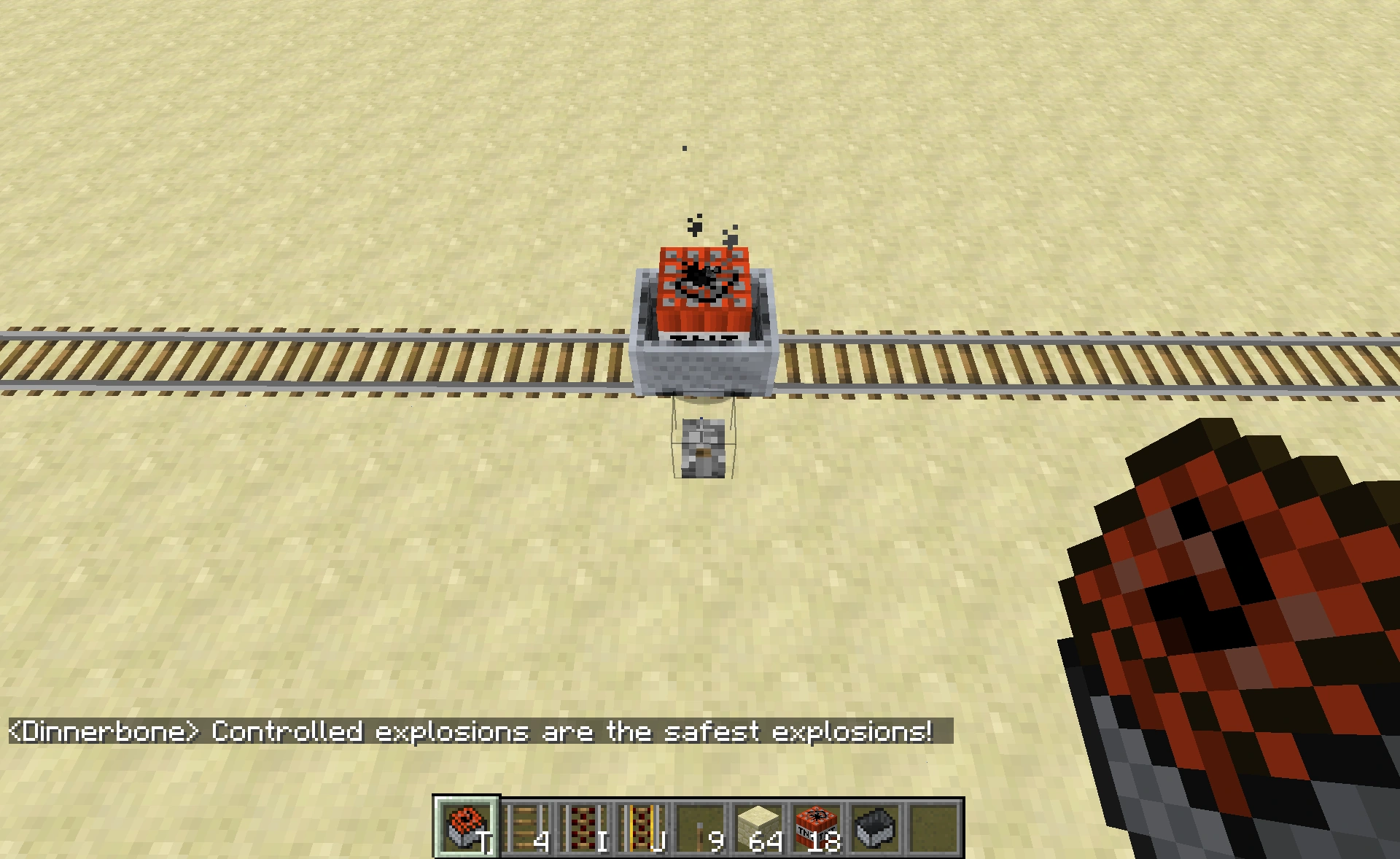 Dinnerboneが公開した、TNT付きのトロッコの制御された爆発を示す画像[7]