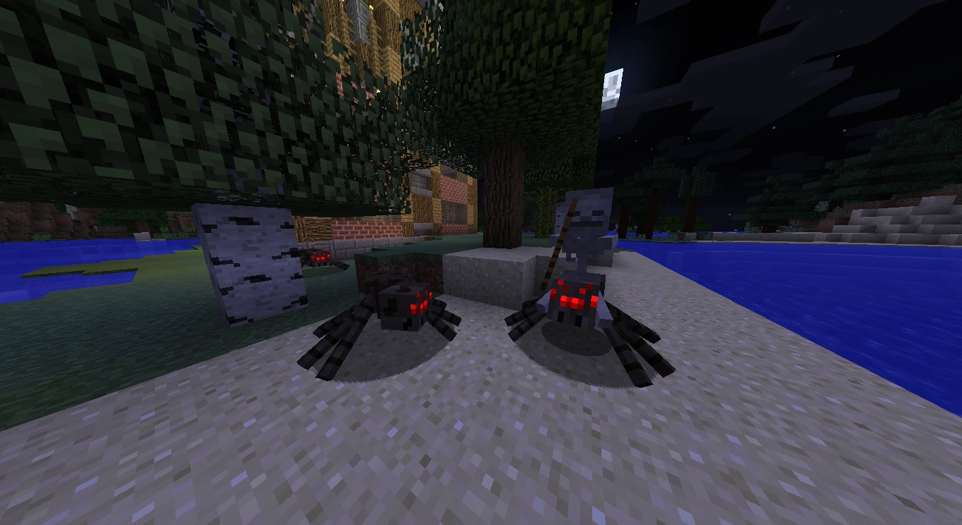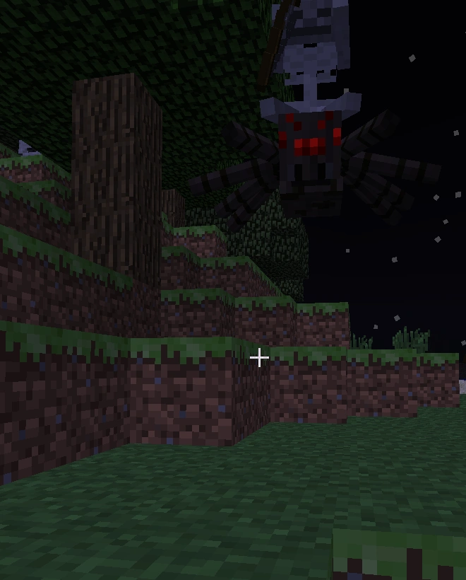 | 1.5 | 비가 추가되면서 거미 조키는 이제 "중립-공격적이게 된다". 뇌우가 치면 스켈레톤은 불이 붙지 않지만, 거미는 적대적이지 않은 상태가 된다. 이 상태에서 스켈레톤은 플레이어를 공격하지만 거미는 플레이어를 뒤쫓지 않는다. (거미 조키가 어두운 지역에 있는 경우를 제외하고) 이러한 일이 일어나는 이유는 거미가 움직임을 조종하기 때문이다. 거미 조키는 16블록 이상 떨어져 있는 플레이어는 공격하지 않는다. | ||||