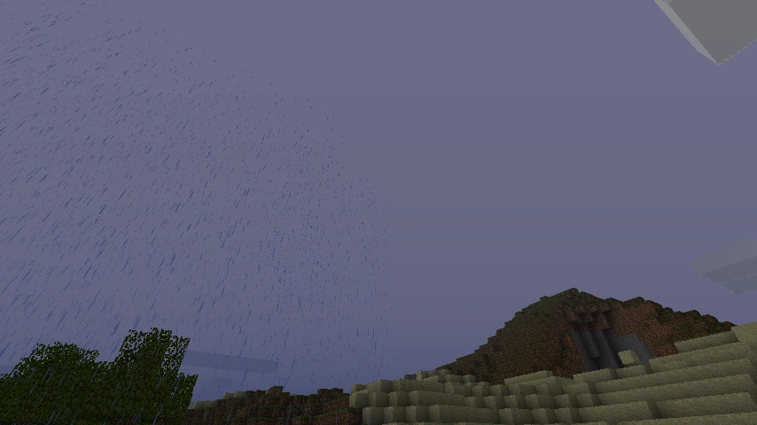 - 비와 눈은 공허에 한 블록만 내린다.(Layer -1) 공허에서 크리에이티브 모드로 하면 볼 수 있다. 참고로 비에서는 아무 입자도 나오지 않는다. 블록 아래로 아무 것도 없기 때문이다.