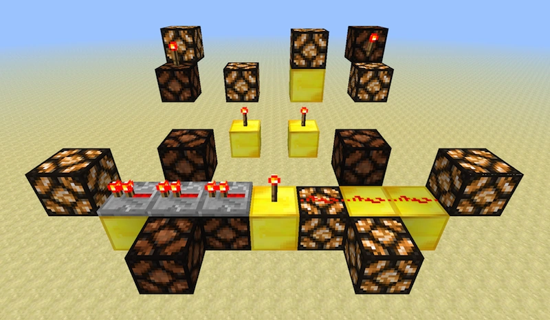 - 레드스톤 횃불이 부착된 블록이 다른 전원으로부터 전력을 공급받으면 레드스톤 횃불은 OFF가 된다. 반대도 성립된다.