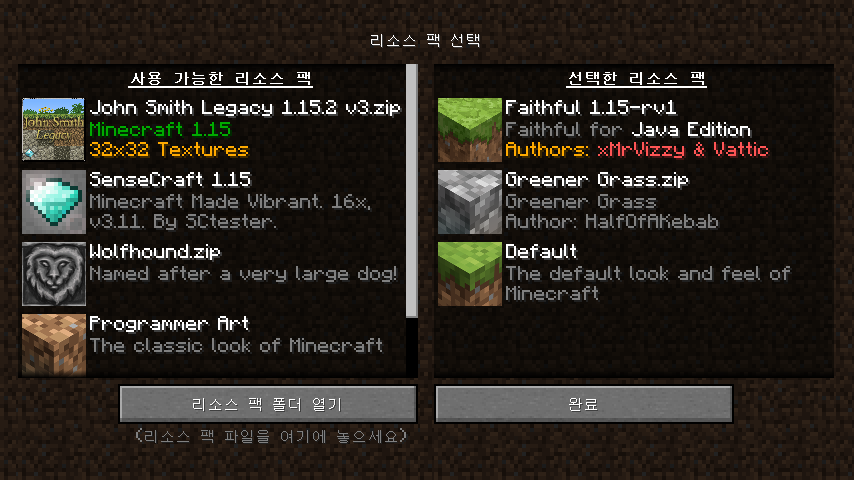 리소스 팩 선택 메뉴. 우측에 기본 포함 활성화된 리소스 팩이 3개 있으며, 왼쪽에서 기타 여러가지 리소스 팩을 선택할 수 있다.