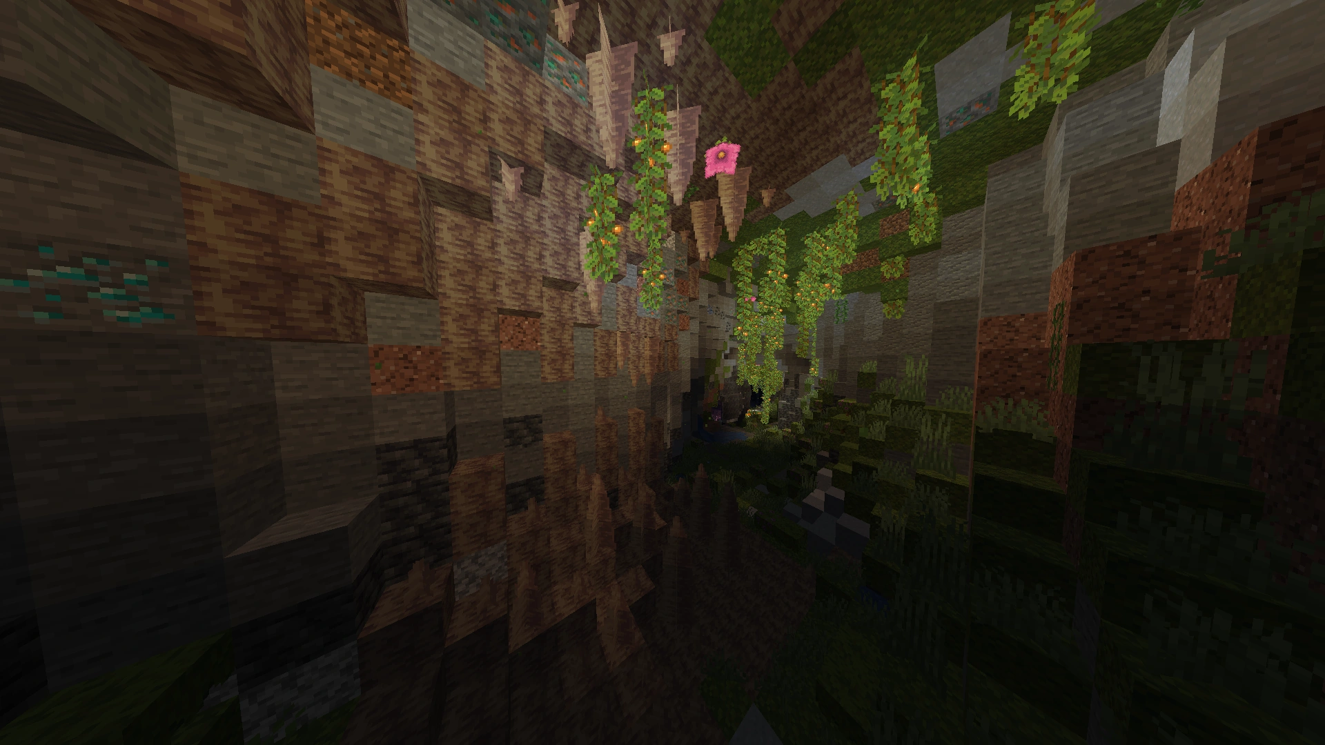 무성한 동굴 (Lush Caves)은 진달래나무 아래 지하에서 발견되며, 독특한 식물들이 자라는 오버월드의 동굴 생물 군계이다.