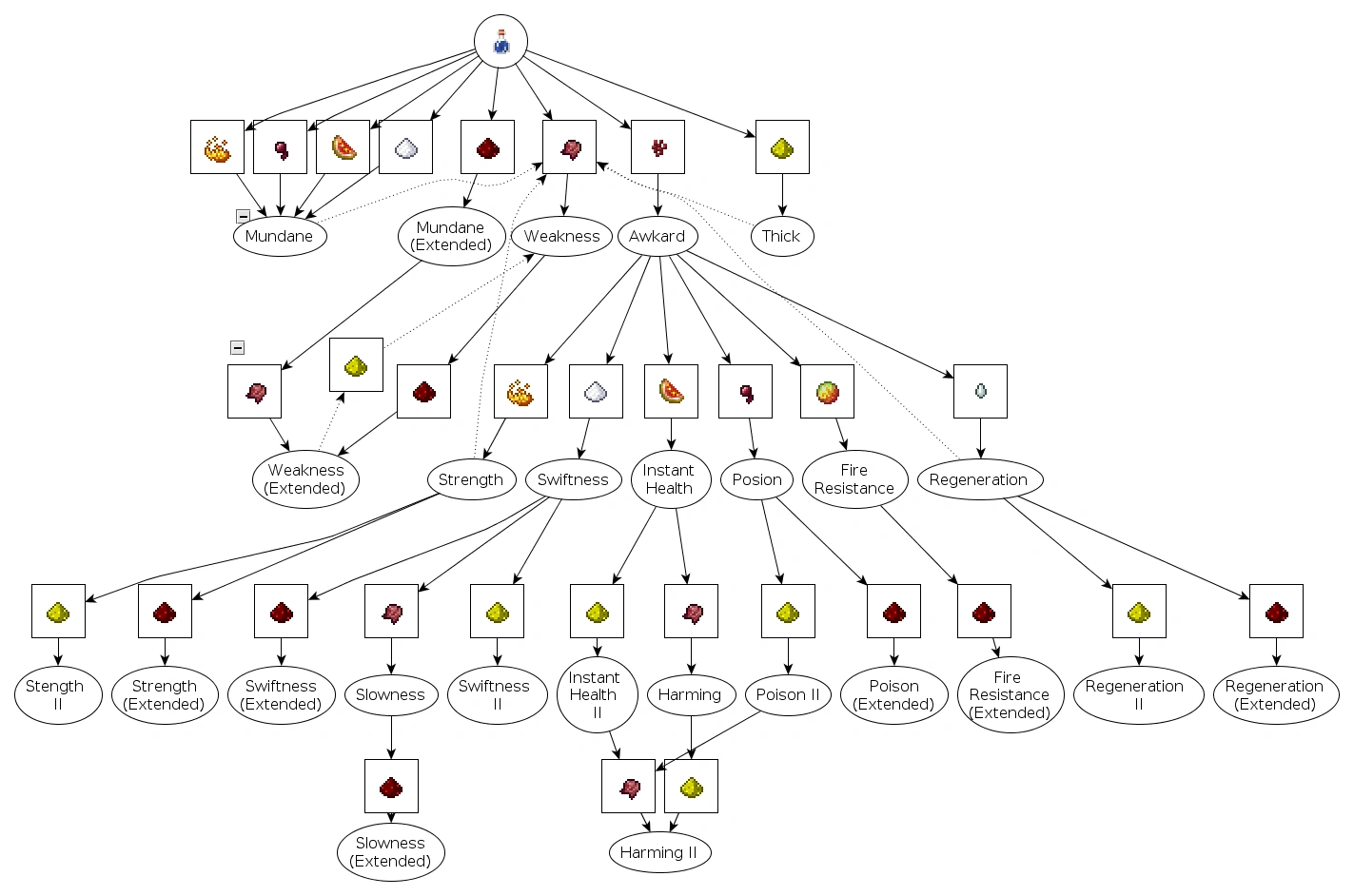 모든 1차 포션은 한 개의 시약을 물병에 증류시켜서 만들며 화약을 섞으면 던질 수 있는 형태의 스플래시 포션을 만들 수 있다.