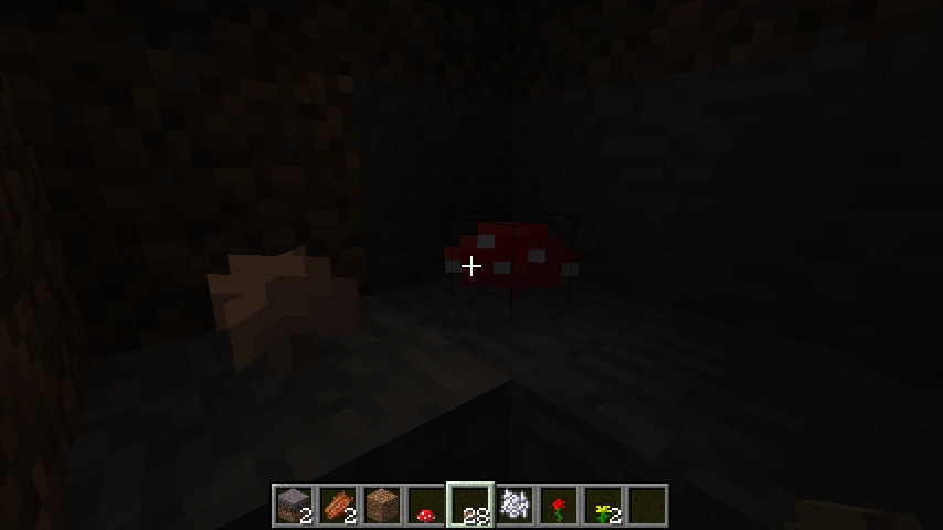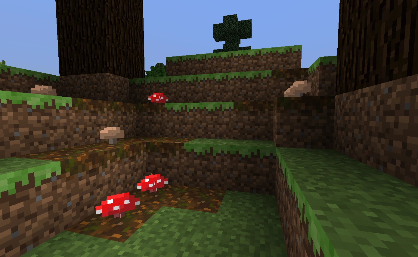 | 버섯은 장식용 아이템이었고, 제작법이 없었고 땅에 심으면 그대로 땅에 남아 있었다. 버섯은 다른 버섯을 제외한 모든 블록에 놓을 수 있었고, 버섯 아래의 블록이 제거되어도 버섯은 그대로 있었다. | |||||