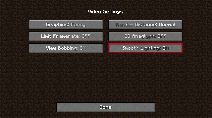 | Smooth Lighting | Lighting is smoothed across the blocks (ambient occlusion), or each block has a distinctive light level. This setting does not change the gameplay in any way, but it has a slight effect on performance. | |||||||||||||||||||||||||||||||||||||||||||||||||||||||||||||||||||||||||||||||||||||||||||||||||||||||||||||||||||||||||||||||||||