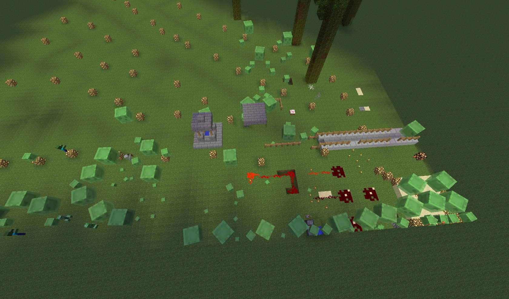 - 세계의 한쪽 끝에서 반대쪽으로 전동 레일을 사용하여 여행해도 35 일 10시간이 소요된다. 이를 위한 레일을 깔기 위해서는 철 블록, 금 블록으로 압축을 한 상태에서도 큰 상자 723 개가 필요하며, 막대기를 만들기 위한 원목만으로도 큰 상자 135개가 필요하다. (레드스톤 횃불은 고려하지 않음) (이들 상자만 만들기 위해서도 원목 53 묶음이 필요하다) 이미 레일을 만든 상태라면, 레일을 담기 위해서 17,361 개의 큰 상자가 필요하다. 이 모든 재료를 모으기 위해서 14,404개의 다이아몬드 곡괭이와 300개의 다이아몬드 도끼 가 필요하다. (내구도 3의 마법을 부여했을 경우, 평균 3,601개의 다이아몬드 곡괭이와 75개의 다이아몬드 도끼)
