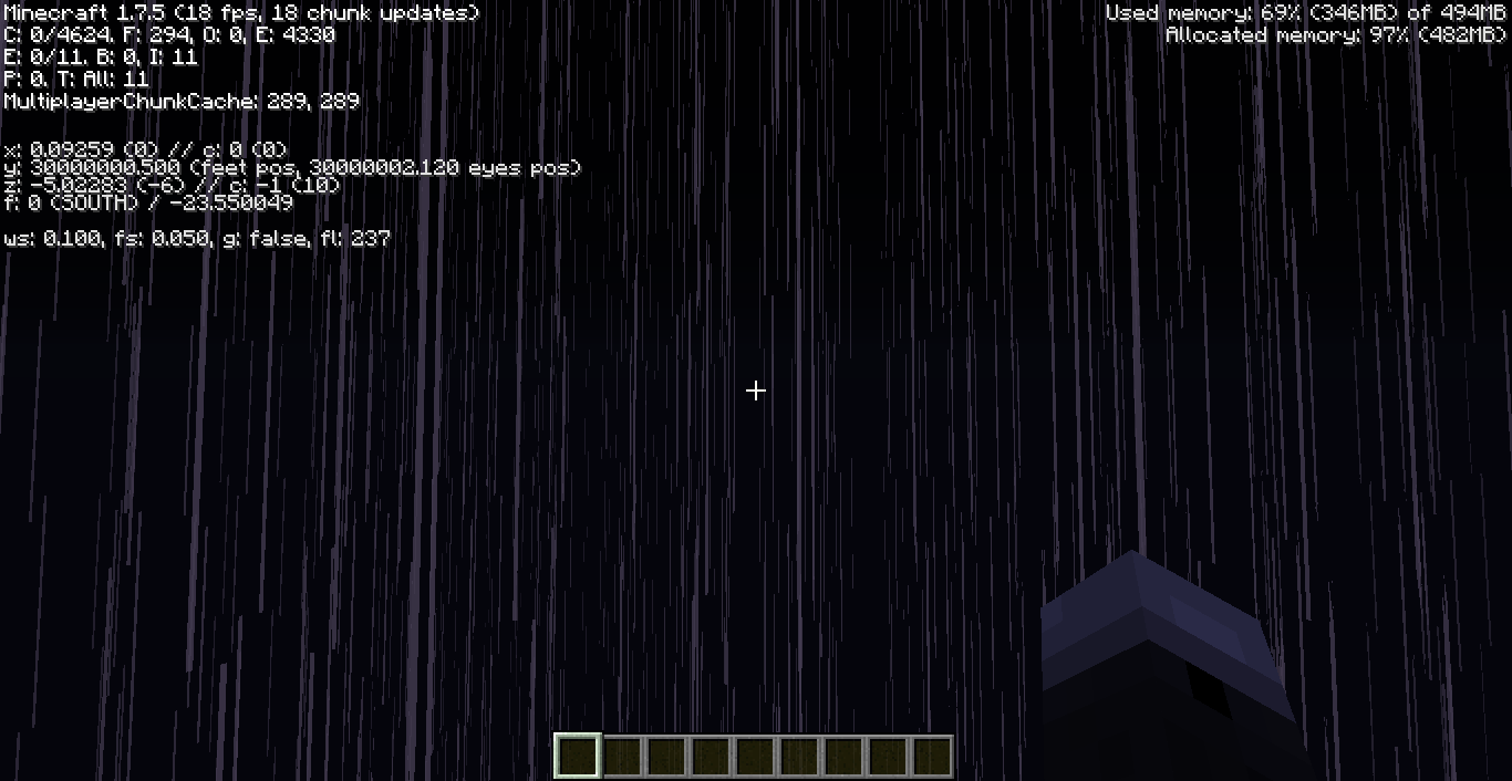 | 1.8.1 | release | Using an NBT editor, beyond X/Z: 30,000,032, the player will get stuck in a glitched position and need to use a program to make their character back. Beyond X/Z: 30,000,064, blocks no longer render. The map is blank from here on out. At every power of two beyond here, rain will being to generate in a line (if only on one axis) and will be separated by larger and larger gaps. At X/Z: 2,147,483,512, blocks stop generating. Beyond X/Z: 25,769,804,000, the clouds no longer render. Beyond X/Z: 34,359,738,368 the game crashes due to chunks being overwritten. | |||