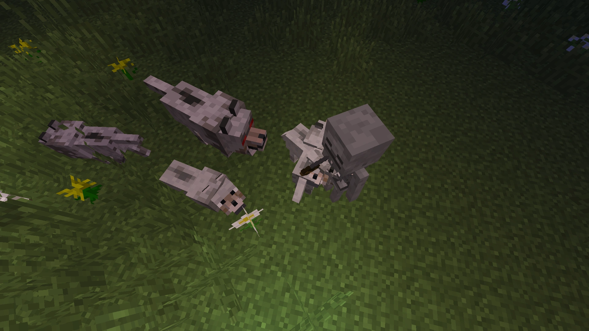 늑대 무리가 스켈레톤을 공격중이다. 늑대의 눈이 빨간 것을 눈여겨 보라.