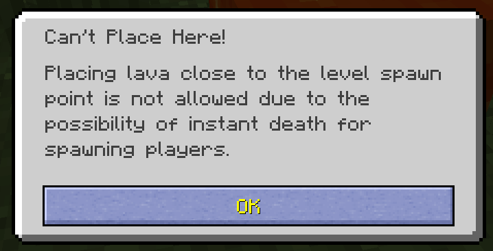 - 콘솔 에디션에서 스폰 지점 근처의 용암은 흐르지 않으며, 용암을 설치하려고 하면 경고가 뜬다. (갤러리 참고)