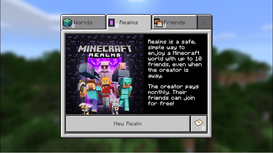 Realms는 구독 기반 서비스이다. 위의 링크는 Mojang 계정 페이지로 연결되며, 현재 Realm을 연장하거나 새 Realms를 구입할 수 있다(PC/Mac의 경우 월$7.99, 포켓(Pocket)의 경우 월$3.99[4]).[5][6]